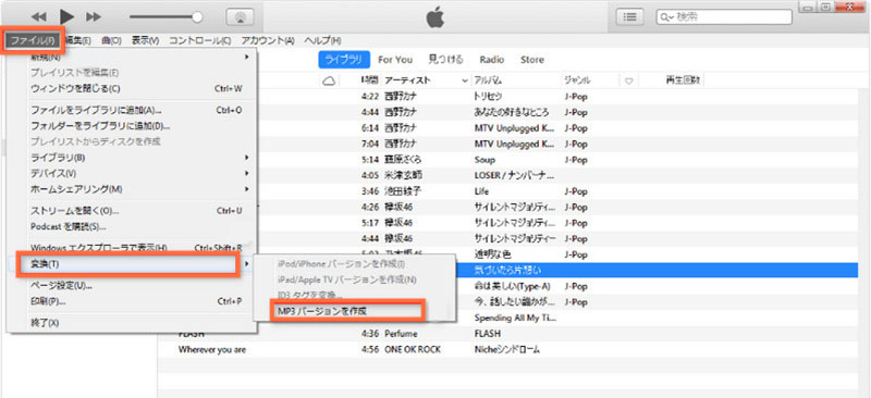 iTunesのライブラリから曲を選択してから、「ファイル」>「変換」>「mp3バージョンを作成」とクリックします。完了すると、iTunes上の曲がMP3に変換されます。