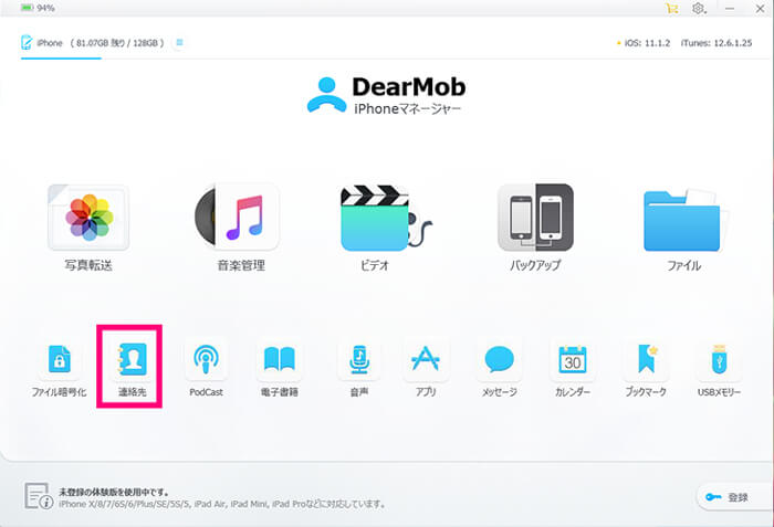- B. DearMob iPhoneマネージャーを開いて、ホーム画面にある「連絡先」のアイコンをタップします。すると、連絡先管理の画面に入ります。