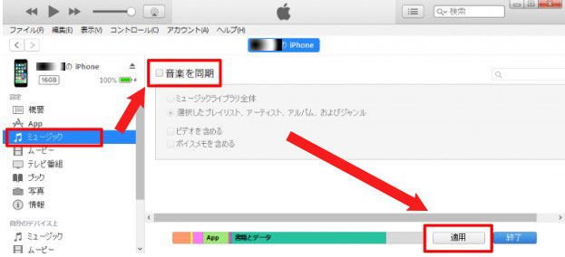 下記の画面が表示されるので、同期したいコンテンツをチェック入れて、「適用」をクリックします。