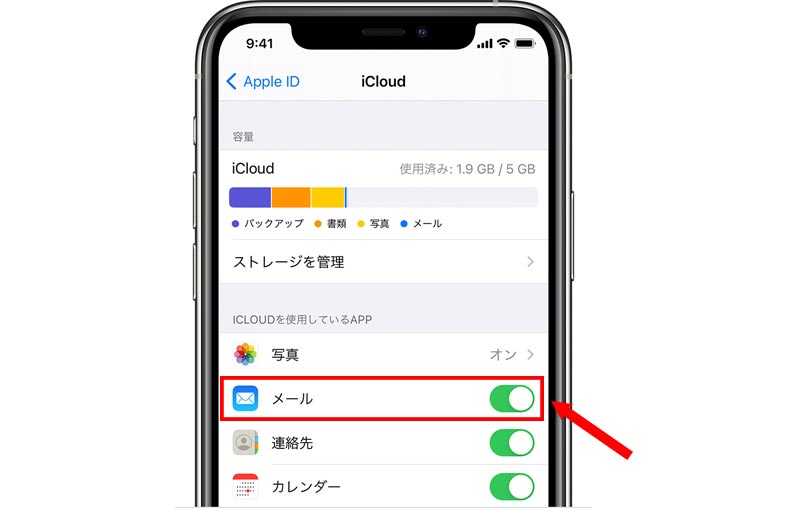 - ❸、「iCloud」を選択して、「メール」が有効になっているかどうかを確認してください。ONになっていれば、メールが正常に届けます。