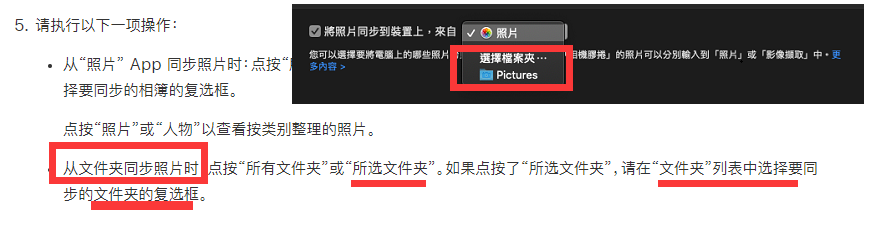 雖然看似毫無用處,但也給小編提供了一個解決思路,重點如下截圖。也就是說,如果照片App內的相簿無法同步至手機,您其實可以選擇轉移照片到檔案夾,然後透過檔案夾來同步照片。